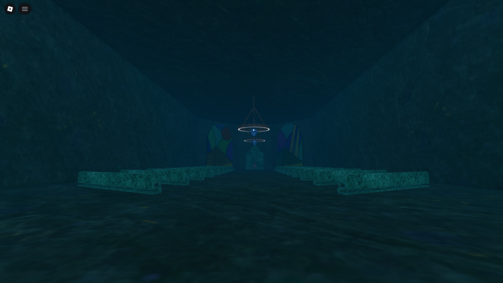教会…?のような場所につきました。 中央の台に座座るとバッジ獲得です。